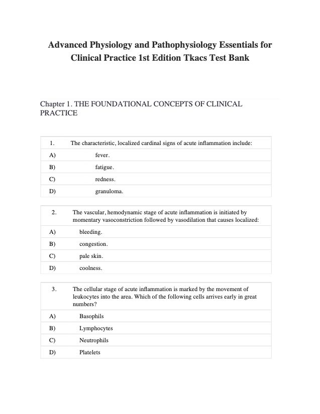 Here is a clear breakdown of what you will get with the Test Bank For Advanced Physiology and Pathophysiology Essentials for Clinical Practice 1st Edition:
