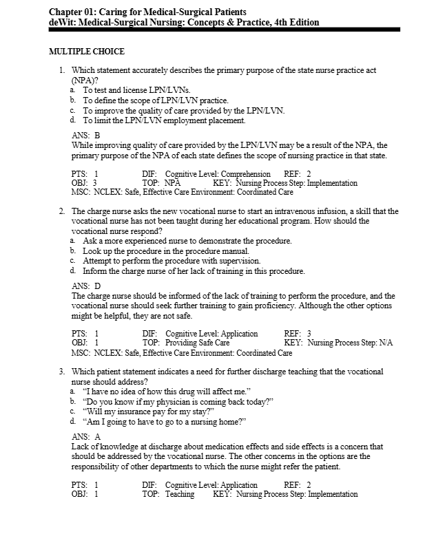 Based on the acclaimed DeWit textbook, this test bank is structured around core nursing processes, integrating anatomy, physiology, pharmacology, and clinical reasoning into a unified framework. Students can expect not only to review exam-level content but also to build professional confidence in patient care planning and safe decision-making.