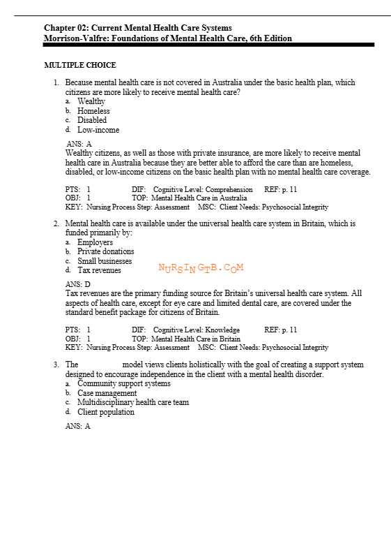 The Test Bank For Foundations of Mental Health Care 6th Edition is developed to align closely with modern nursing curricula and current mental health care standards as of June 2025. Every technical element is structured to support accuracy, usability, and learning efficiency.