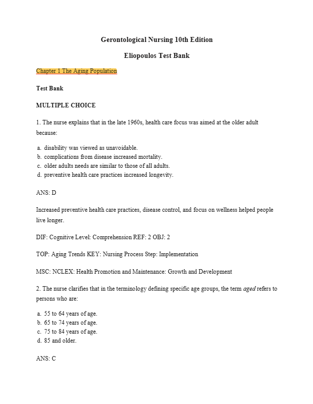 Test Bank For Gerontological Nursing 10th Edition Eliopoulos