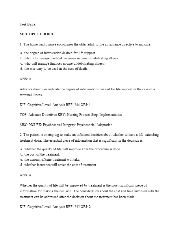 Designed to complement the main Gerontological Nursing textbook, this test bank offers comprehensive question sets and rationales that deepen learning through critical thinking. It equips students and instructors with evidence-based materials tailored to modern healthcare environments, emphasizing the importance of compassion, communication, and professionalism in the care of older adults.