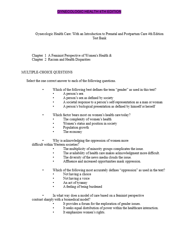 Test Bank For Gynecologic Health Care With an Introduction to Prenatal and Postpartum Care 4th Edition offers a meticulously crafted collection of test questions directly aligned with the edition of this renowned nursing textbook.